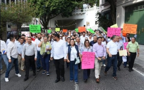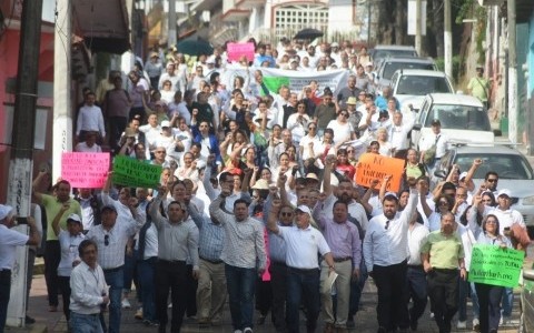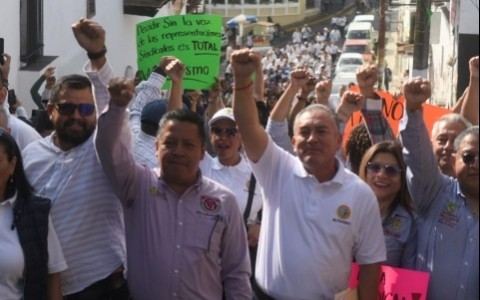Veinticuatro sindicatos integraron un frente y marcharon al Congreso de Veracruz para exigir que se detenga la reforma a la Ley Estatal del Servicio Civil.