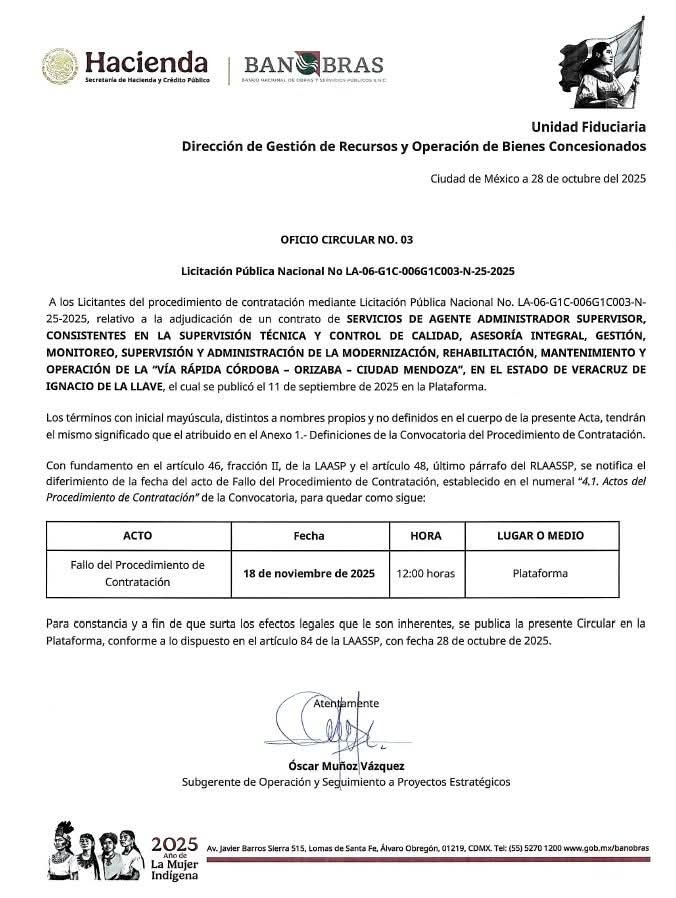 Orizaba, Ver.- (AVC) A pesar de que la gobernadora de Veracruz, Rocío Nahle García, anunció que se cancelaría la instalación de las casetas de peaje dentro del proyecto de modernización de la autopista 150D Ciudad Mendoza-Córdoba, la licitación continúa en la página del Gobierno Federal, la cual únicamente presenta un cambio de fecha, por lo que el proyecto continúa en pie junto con la instalación de las garitas en Vicente Guerrero y Fortín de Las Flores. Incluso la empresa Cal y Mayor con personal de Capufe, se encuentran en el retorno de Vicente Guerrero y El PIVO, realizando estudios de mecánica de suelos y topografía, lo que deja en claro que la obra del confinamiento de la Autopista continua en marcha. El Banco Nacional de Obras y Servicios Públicos (Banobras), en su carácter de fiduciario del Fideicomiso 1936, conocido como Fondo Nacional de Infraestructura (FONADIN), re-emitió la licitación pública nacional número LA-06-G1C-006G1C003-N-25-2025, con el objetivo de contratar los servicios de un Agente Administrador Supervisor (AAS) para el tramo carretero de la autopista México–Veracruz, correspondiente a la zona de Córdoba, Orizaba y Ciudad Mendoza. De acuerdo con la convocatoria, el AAS será responsable de la supervisión técnica, administrativa y operativa del proyecto, el cual contempla la ampliación de carriles y la construcción de dos nuevas casetas de peaje dentro de dicho tramo, considerado uno de los más transitados del corredor carretero nacional. A través de un oficio emitido con fecha del 28 del presente y firmado por Óscar Muñoz Vázquez, subgerente de Operación y Seguimiento a Proyectos Estratégicos de Banobras, se informa que el fallo de la licitación se emitirá el 18 de noviembre, lo que confirma la continuidad del proyecto y la instalación de las tan rechazadas casetas de peaje. A la licitación, publicada originalmente el 11 de septiembre de 2025, únicamente se le pospuso el fallo, tal y como se logra leer en el Circular No. 03 dentro del procedimiento LA-06-G1C-006G1C003-N-25-2025, en dónde se establece que el anuncio se realizará de manera digital conforme a la normativa federal en materia de adquisiciones de Banobras. A pesar del rechazo ciudadano, de empresarios y autoridades municipales y estatales, el proyecto para la instalación de las casetas de peaje en Vicente Guerrero y Fortín continúa en marcha apresuradamente.