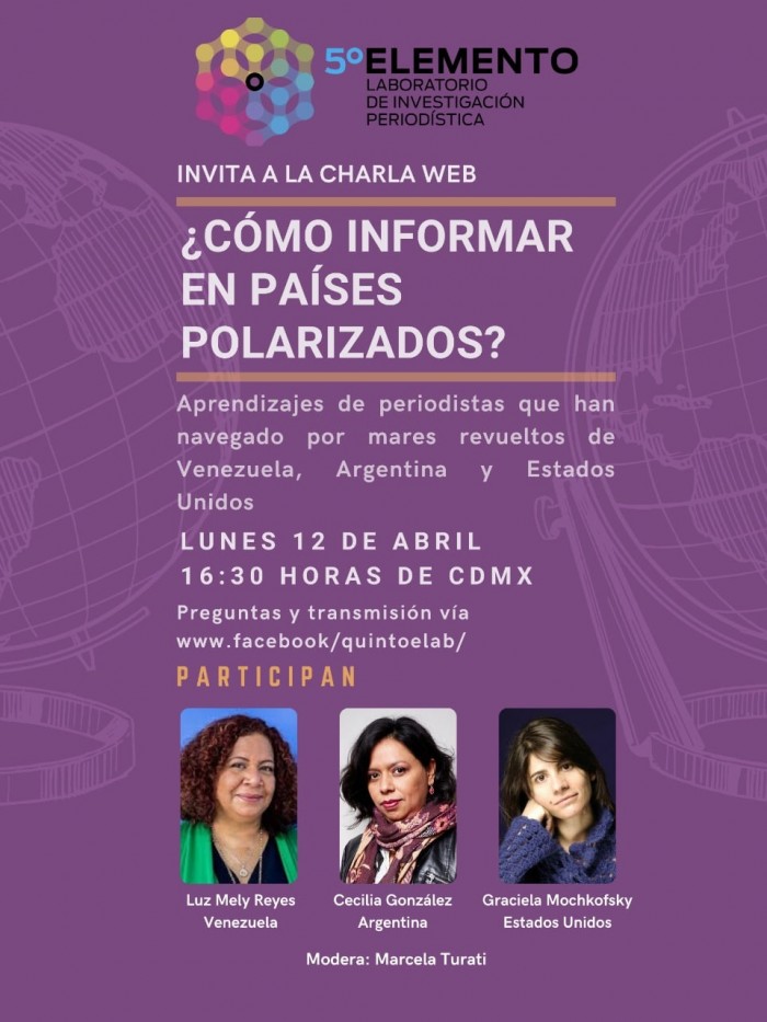 Xalapa, Ver.- (AVC/Tania Rivera) ¿Cómo informar en países polarizados? Esa fue la pregunta que se hicieron las periodistas Luz Mely Reyes, Graciela Mochkofsky, Cecilia González, durante una charla con Marcela Turati, organizada por Quinto Elemento, laboratorio de investigación periodística.