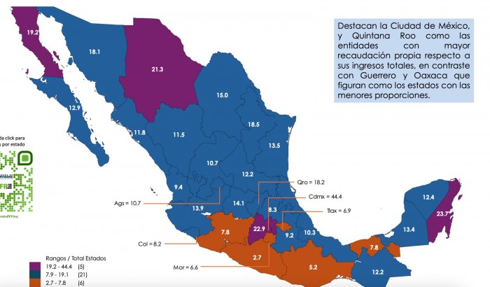 Xalapa, Ver.- (AVC/Valeria Ramos) Veracruz registró una baja proporción de recaudación propia en 2023, al reportar que solo el 7.8 % de sus ingresos estatales provinieron de fuentes locales, de acuerdo con el mapa estadístico del Centro de Estudios de las Finanzas Públicas (CEFP). Este porcentaje coloca a Veracruz en el grupo de entidades con menor autonomía financiera, por debajo del promedio nacional, y dentro del rango más bajo en la clasificación nacional (entre 2.7 % y 7.8 %), junto con entidades como Oaxaca (5.2 %), Guerrero (2.7 %) y Morelos (6.6 %). En contraste, la Ciudad de México encabeza el listado con un 44.4 %, seguida por Quintana Roo (23.7 %), Baja California Sur (22.9 %) y Campeche (21.3 %), todas con porcentajes superiores al 19.2 %. La recaudación propia incluye ingresos generados por impuestos, derechos, productos y aprovechamientos locales, sin contar transferencias federales ni disponibilidad inicial. Su baja proporción en Veracruz evidencia una fuerte dependencia del presupuesto federal.