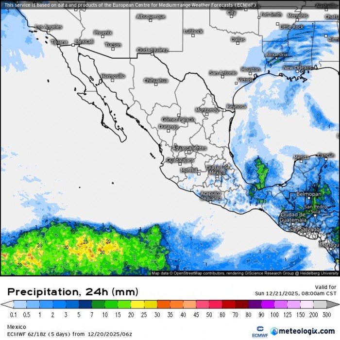 Acumulados de 5 a 20 mm en promedio, con máximos de 50 a 70 mm entre las cuencas del Cazones–Colipa y Papaloapan–Tonalá; de 20 a 50 mm en el resto del estado.