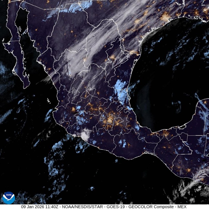 El Frente Frío 27 se localiza esta mañana desde la región de los Grandes Lagos hasta el centro de Texas. Se prevé que ingrese al noroeste del Golfo de México durante la medianoche, cruce Veracruz el sábado 10 y se estacione sobre Tabasco entre el domingo 11 y lunes 12.