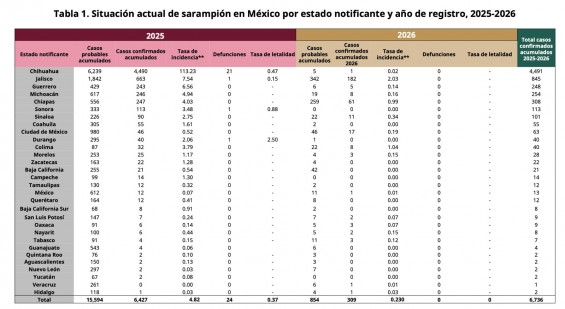 A nivel nacional, el informe reporta 6,736 casos confirmados acumulados de sarampión entre 2025 y 2026, con 24 defunciones. Los grupos de edad más afectados son niñas y niños de 1 a 4 años, seguidos por menores de 5 a 9 años, lo que ha llevado a reforzar campañas de vacunación y detección oportuna.