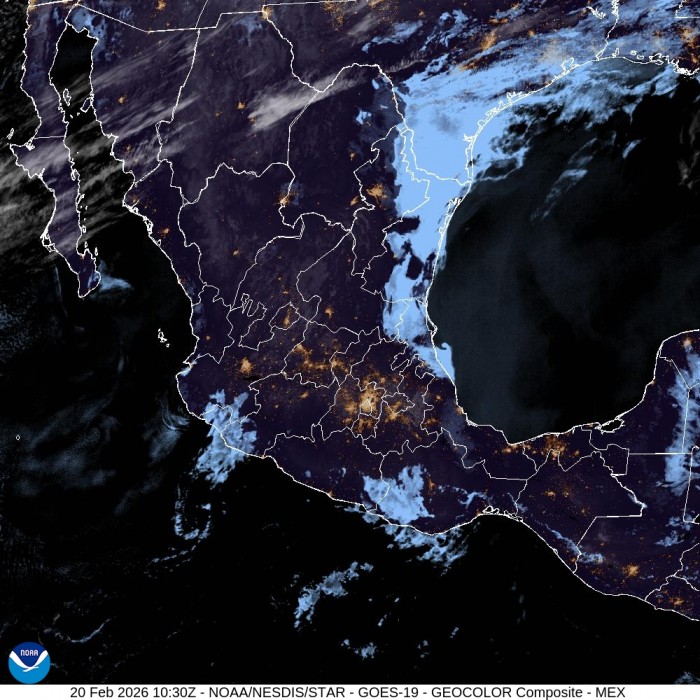 Xalapa, Ver.- (AVC) Este viernes y el transcurso del sábado continuará el ambiente muy caluroso en el estado de Veracruz, con probabilidad prácticamente nula de lluvia; viento del Sur, Sureste y Este de 20 a 35 km/h, con el desarrollo de un evento de *Surada* con rachas máximas de 65 a 80 km/h, principalmente en sectores de la zona sur. Por lo anterior, se recomienda evitar la exposición prolongada al sol, mantener una adecuada hidratación y no realizar actividades que puedan desencadenar incendios. Los modelos de pronóstico indican cambios sustanciales en la entidad veracruzana por los efectos de un frente frío y una masa ártica, provocando incremento en el potencial de lluvias, evento de Norte fuerte con rachas violentas en la costa para el domingo 22 y parte del lunes 23, además de un marcado descenso de temperatura. Condiciones actuales: 30.6/19.8 en Tuxpan 32.4/11.4 en Xalapa 33.6/20.6 en Boca del Río 32.8/15.4 en Orizaba ——/—— en Coatzacoalcos Lluvias acumuladas (mm) en los observatorios meteorológicos de la CONAGUA: Sin lluvias. Esta mañana, de acuerdo con la imagen de satélite, se aprecia nubosidad baja en el norte del estado, donde también se presentan bancos de niebla; en el resto de la entidad domina cielo mayormente despejado.