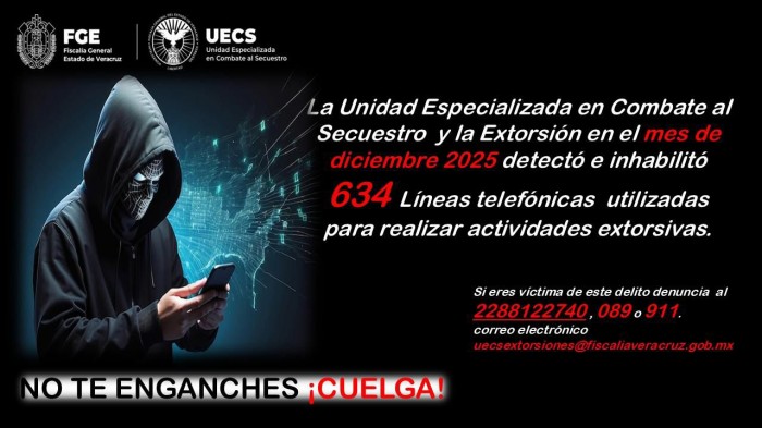 Xalapa, Ver.- (AVC) Durante diciembre de 2025, la Unidad Especializada en Combate al Secuestro y la Extorsión (UECS) inhabilitó 634 líneas telefónicas utilizadas para cometer extorsiones en el estado, como parte de acciones para prevenir este delito.