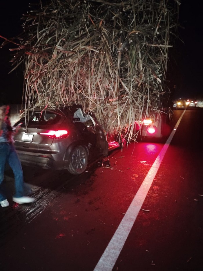 Tras el choque, la carga de caña cayó sobre el vehículo particular, lo que agravó la situación y obligó al cierre total de la circulación con dirección de Veracruz hacia Xalapa.
