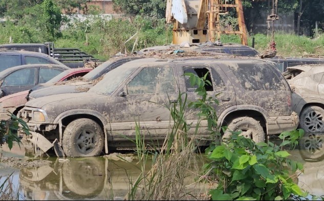 2025-11-11.- A más de un mes de la inundación por el desbordamiento de río Cazones en Poza Rica, más de una decena de vehículos que fueron arrastrados siguen atrapados en un predio donde operaba un pozo petrolero de la colonia Palma Sola.