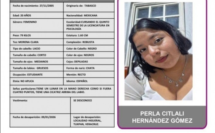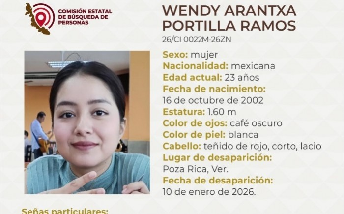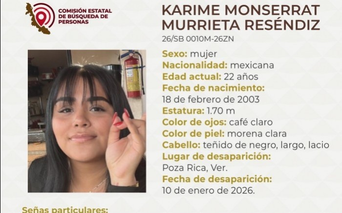 Poza Rica, Ver.- (AVC) Cinco mujeres permanecen desaparecidas en municipios del norte de Veracruz en lo que va de 2026. Los reportes más recientes corresponden a Poza Rica y Tuxpan, de acuerdo con fichas oficiales de búsqueda. La Comisión Estatal de Búsqueda emitió fichas para localizar a Perla Citlali Hernández Gómez, de 20 años, vista por última vez el 9 de enero en la localidad de Higueral, municipio de Tuxpan. Otro reporte corresponde a Emma Nayeli Jiménez Pérez, de 21 años, cuyo paradero se desconoce desde el 13 de enero en Poza Rica. Estos casos se suman a otros tres reportes ocurridos en los primeros días del año. El 1 de enero fue reportada la desaparición de Grecia Zulema Cárdenas González, de 28 años, en Papantla. El 10 de enero, Wendy Arantxa Portilla Ramos y Karime Monserrat Murrieta fueron vistas por última vez después de asistir a un funeral en la región norte del estado. La Fiscalía General del Estado de Veracruz activó los protocolos correspondientes y difundió señas particulares para apoyar las labores de localización. Familiares de las mujeres desaparecidas solicitaron apoyo ciudadano para aportar información que permita ubicarlas y facilitar su regreso. Las autoridades mantienen abiertas las investigaciones y reiteraron que cualquier dato puede ser reportado de forma confidencial a los canales oficiales de búsqueda establecidos en Veracruz.