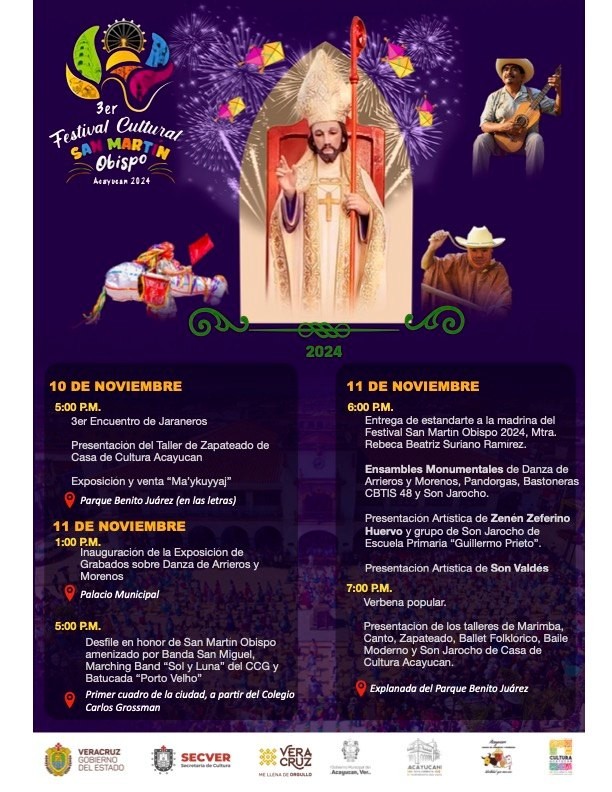 Acayucan, Ver.- El H. Ayuntamiento Constitucional de Acayucan, en coordinación con la Secretaría de Cultura de Veracruz invitan al 3er Festival Cultural San Martín Obispo 2024 que tendrá lugar el domingo 10 y el lunes 11 de noviembre en el municipio de Acayucan, Ver. Este festival es una iniciativa que busca fortalecer las expresiones del Patrimonio Cultural local y acompañar la fiesta popular que tiene lugar cada año con motivo de la celebración del Santo Patrono San Martín Obispo. Además, busca fomentar la participación infantil en las artes tradicionales que constituyen pilares de la propia identidad cultural del municipio. El domingo 10 de noviembre se lleva a cabo el Tercer Encuentro de Jaraneros en la Casa de Cultura de Acayucan. El lunes 11 de noviembre se inaugura una exposición gráfica en torno a la danza de arrieros y morenos; más tarde inicia su recorrido la procesión en honor a San Martín Obispo acompañada por la Banda San Miguel, la Marching Band Sol y Luna del Colegio Carlos Grossman y la Batucada Porto Velho. Esa tarde se realiza el monumental Ensamble de Danzas de arrieros y morenos, pandorgas, bastoneras y el Ensamble de Son Jarocho. El público podrá disfrutar de presentaciones artísticas en la Escuela Primaria “Guillermo Prieto”, a cargo de Zenén Zeferino y su grupo de Son Jarocho, y el grupo Son Valdés. Para finalizar la celebración, en la explanada del Parque Benito Juárez, se podrá disfrutar de la Verbena Popular en la que participan los talleres de marimba, canto, zapateado, ballet folclórico, baile moderno y son jarocho de la Casa de Cultura de Acayucan. El Festival Cultural San Martín Obispo 2024 es una de las propuestas seleccionadas que recibieron apoyo derivado de la convocatoria Fortalecimiento de Festivales y Festividades del Estado de Veracruz 2024, iniciativa que reafirma el compromiso de la Secretaría de Cultura de Veracruz con la preservación y promoción de las tradiciones culturales de la entidad. La SECVER invita a la población de Acayucan y sus municipios vecinos a disfrutar del 3er Festival Cultural San Martín Obispo 2024, los días domingo 10 y lunes 11 de noviembre. Para conocer más información sobre este festival, consulta las redes sociales @AcayucanCultura2225, @DesarrolloCulturalRegionalSECVER y @SECVERoficial. También invitamos a visitar el sitio web oficial de la Secretaría www.culturaveracruz.gob.mx.