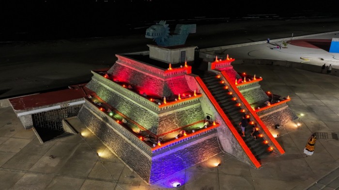 Además de los cementerios, la pirámide de Quetzalcóatl, en el malecón, fue decorada con flores de cempasúchil y velas que iluminan sus escaleras, simulando la entrada al “más allá”, en alusión al tránsito entre la vida y la muerte.