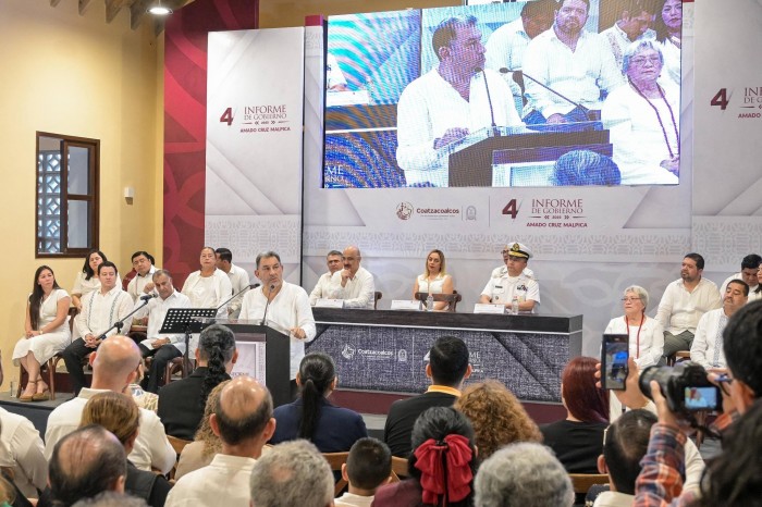 Coatzacoalcos,Ver.- (AVC) En sesión de Cabildo en ‘Chantli, La Casa del Pueblo’, el alcalde de Coatzacoalcos, Amado Cruz Malpica, presentó su cuarto informe a 33 días de concluir su gestión, con datos de obras, seguridad, programas sociales y proyecciones económicas.