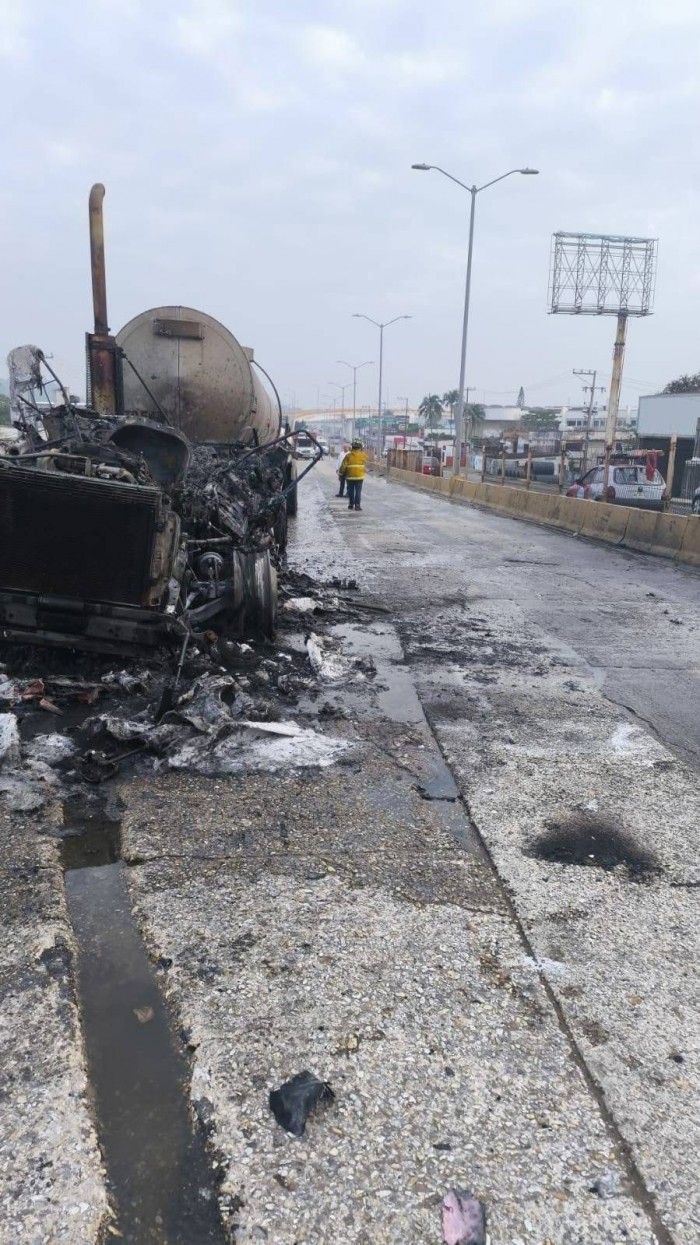 Coatzacoalcos, Ver.- (AVC/Maythe Morales) Una pipa fue consumida por el fuego mientras circulaba sobre el puente Joroba, en la colonia Primero de Mayo del municipio de Coatzacoalcos, lo que provocó el cierre temporal de la vialidad.