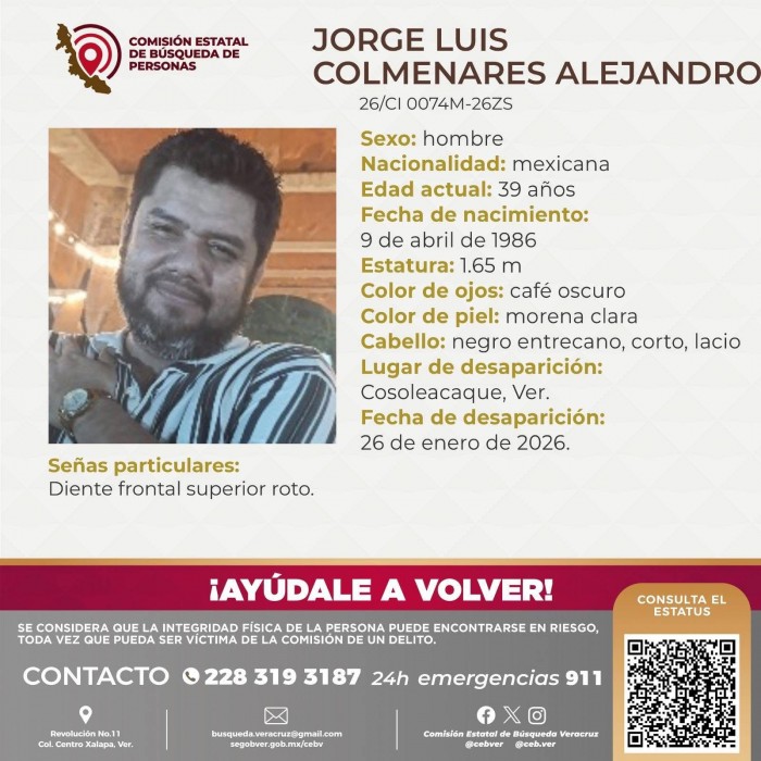 Cosoleacaque, Ver.- (AVC/Maythe Morales) Jorge Luis Colmenares y Antonio Escobar, empresarios del ramo del entretenimiento en la zona sur de Veracruz, fueron privados de la libertad por un grupo armado que irrumpió con violencia en un domicilio del fraccionamiento Los Mangos, en el municipio de Cosoleacaque. Los hechos ocurrieron la madrugada del lunes 26 de enero, cuando cerca de 20 hombres armados, que se desplazaban en un automóvil y una camioneta, llegaron al lugar y con la ayuda de un marro, ingresaron por la puerta principal de la vivienda en la que se encontraba los dos empresarios, una mujer y dos menores de edad. Luego de causar destrozos hizo meter a los ocupantes a punta de pistola, se llevaron por la fuerza a los masculinos y desde entonces, se desconoce su paradero. De acuerdo con el testimonio de la pareja de uno de ellos, a pesar de que existe una denuncia, que derivó en la carpeta de investigación CLC/DXXI/F2/048/2026, no hay avances en la búsqueda, por lo que teme por la integridad de ambos. La mujer relató que posee vídeos de cámaras de seguridad donde se observan las unidades y a varios de los sujetos con el rostro cubierto, sin embargo, las evidencias no han sido suficientes para que se agilice el proceso de búsqueda. La Comisión Estatal de Búsqueda emitió las fichas para la localización de ambas víctimas; sin embargo, la familia señala que no ha recibido información sobre avances y que tampoco ha habido contacto por parte de los captores. Afuera de la fiscalía regional de Cosoleacaque, la mujer expresó temor por su seguridad y la de sus hijos, y pidió a las autoridades estatales protección y acciones urgentes para localizarlos con vida.