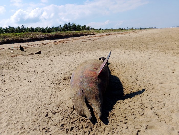 Aparece delfín sin vida en playas de Agua Dulce, lo atribuyen a la contaminación de hidrocarburo