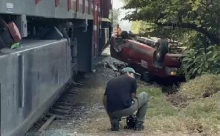 La unidad fue impactada y arrastrada por la locomotora, para finalmente quedar volcada a un costado de las vías.