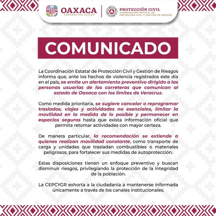 “Se emite un alertamiento preventivo dirigido a las personas usuarias de las carreteras que comunican al estado de Oaxaca con los límites de Veracruz. Como medida prioritaria, se sugiere cancelar o reprogramar traslados, viajes y actividades no esenciales, limitar la movilidad en la medida de lo posible” afirma el comunicado del gobierno de Oaxaca