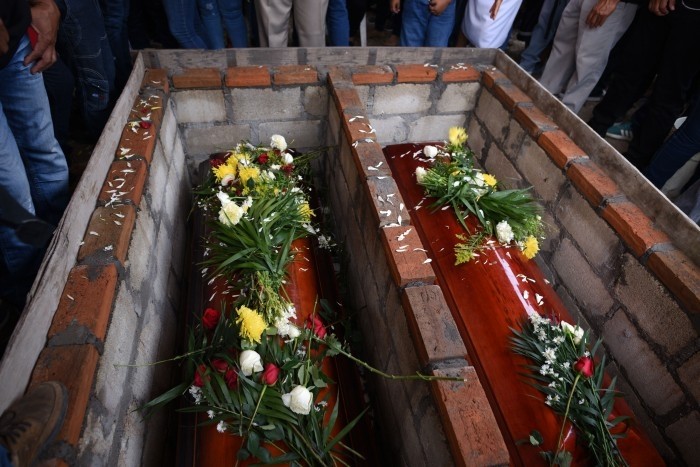 Familiares colocaron unas rosas rojas y otras flores blancas sobre los féretros antes de que fueran cubiertos por unas lozas.