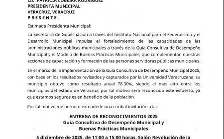 Veracruz, Ver.- (AVC) El Ayuntamiento de Veracruz, encabezado por la alcaldesa Paty Lobeira, fue reconocido por la Secretaría de Gobernación a través del Instituto Nacional para el Federalismo y el Desarrollo Municipal (INAFED) por haber obtenido el más alto puntaje en el estado de Veracruz dentro de la Guía Consultiva de Desempeño Municipal (GDM) 2025, con una calificación de 78.30%.