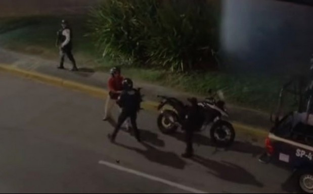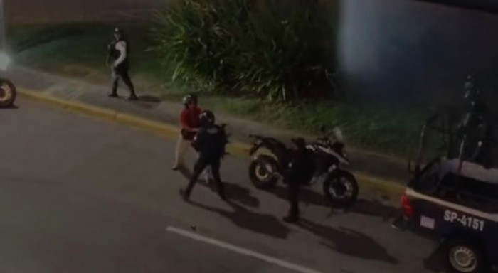 Un usuario de las redes sociales grabó desde la plaza comercial el momento en que el motopatrullero, de la Policía Estatal, se abalanza contra la humanidad del fotorreportero, le tira un golpe, pero afortunadamente portaba su casco, no obstante, su teléfono sí cayó al pavimento.