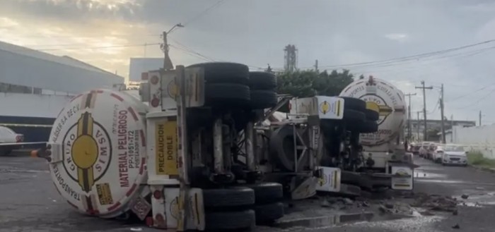 Veracruz, Ver.- (AVC) La mañana de este martes, una pipa cargada con gasolina volcó en la ciudad de Veracruz, luego de caer a un socavón en la calle Independencia Norte, de la colonia Manuel Contreras.
