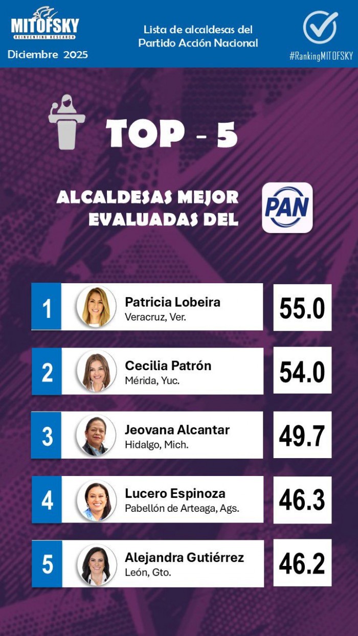 Asimismo, Lobeira se mantiene con una alta aprobación dentro del listado de alcaldes del Partido Acción Nacional, consolidándose como la alcaldesa mejor evaluada del PAN a nivel nacional, según el mismo ejercicio demoscópico.