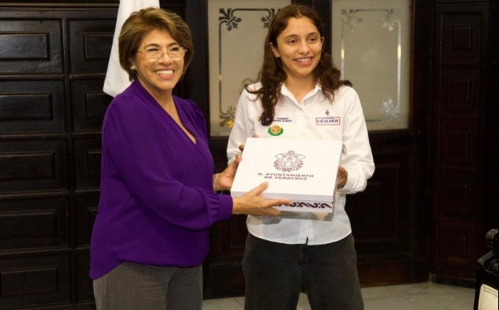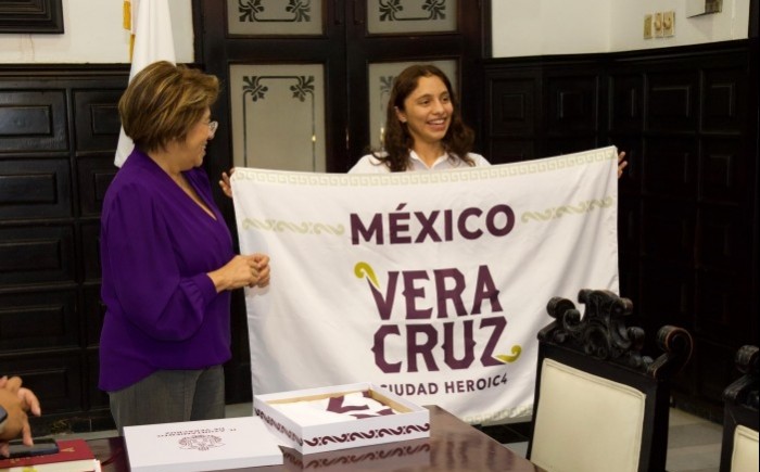 Veracruz, Ver.- (AVC) Portando con orgullo una bandera de Veracruz y México que le entregó la alcaldesa Rosa María Hernández Espejo, la joven veracruzana Valeria Palacios Cruz recibirá el próximo 20 de enero en Londres, Inglaterra, la medalla por haber obtenido el primer lugar mundial en el concurso World Education Medal for Students de inteligencia artificial, con participación de 130 países. La presidenta municipal destacó que este logro es reflejo del talento de la juventud veracruzana y señaló que su administración continuará generando condiciones para que más jóvenes accedan a oportunidades en educación, ciencia e innovación, al considerar estos rubros como prioridad para el desarrollo del municipio. Valeria Palacios Cruz cursa simultáneamente las carreras de Ingeniería Electrónica en el Tecnológico Nacional de México campus Veracruz y la de Ingeniería Mecatrónica en la Universidad Ceulver, y es egresada del Conalep Veracruz, donde inició su formación académica y proyectos que hoy la posicionan a nivel internacional. Con acciones como este reconocimiento, el Ayuntamiento de Veracruz refrenda su compromiso con el impulso al talento joven, fortaleciendo una política pública que apuesta por la educación y la innovación como motores de bienestar y desarrollo social.
