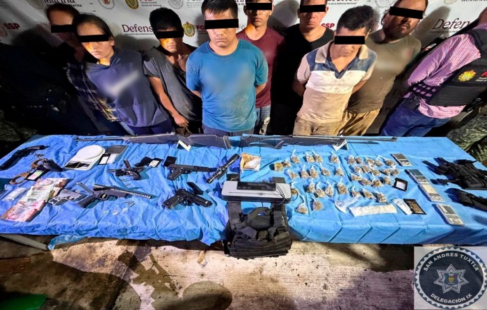 A los detenidos, les aseguraron diversas dosis de drogas, dos bolsas de cristal, cinco réplicas de arma corta, dos armas largas de aire, cartuchos, cargadores, dos radios, dos chalecos tácticos, una fornitura y una mira telescópica.