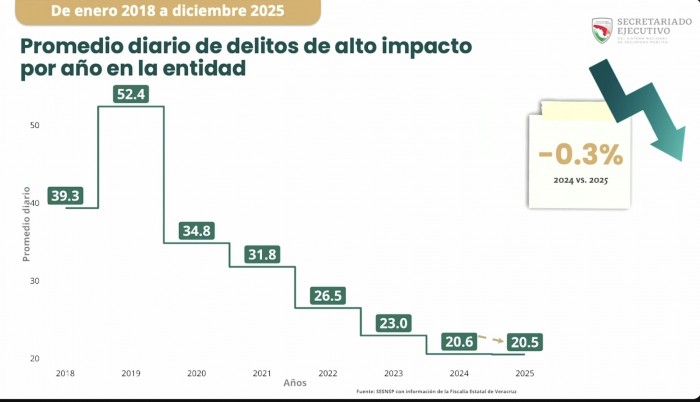 Ante la presidenta de la República y la gobernadora de Veracruz, destacó que los delitos de alto impacto también registraron una reducción, al pasar de 20.6 a 20.5 delitos diarios en promedio entre 2024 y 2025, lo que representa una disminución del 0.3 por ciento.