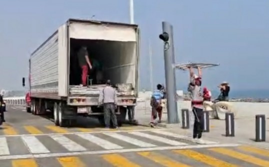 Una cuadrilla de trabajadores bajó las estructuras metálicas de una unidad de carga, las cuales instalaron a lo largo del bulevar.