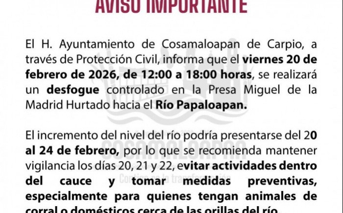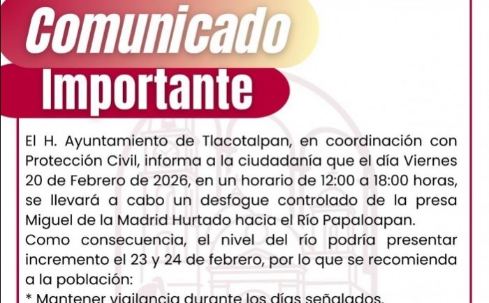 Veracruz, Ver.- (AVC/José Juan García) Los ayuntamientos de Tlacotalpan y Cosamaloapan avisaron a la población que habrá un desfogue controlado en la presa Miguel de la Madrid Hurtado, mejor conocida como Cerro de Oro, este 20 de febrero, por lo que el nivel del río Papaloapan podría incrementar su nivel en los días próximos.