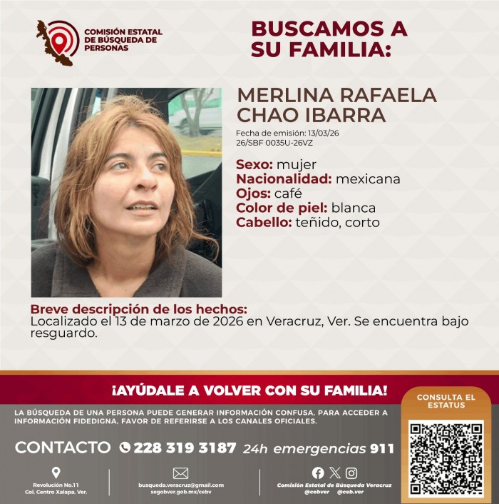 Veracruz, Ver.- (AVC) La Comisión Estatal de Búsqueda (CEB) solicitó la colaboración de los ciudadanos para localizar a una mujer que se encuentra bajo resguardo en la ciudad de Veracruz. De acuerdo con la ficha 26/SBF0035U-26VZ, publicada por la CEB, se trata de Merlina Rafaela Chao Ibarra, quien es mexicana, cuenta con ojos color café, piel blanca y cabello teñido y corto. Según los hechos, Merlina Rafaela Chao Ibarra fue localizada el 13 de marzo en la ciudad de Veracruz y se encuentra bajo resguardo, por lo que se trata de localizar a sus familiares. Por último, la CEB recomendó que cualquier dato sobre los familiares de la mujer bajo resguardo se reporte al correo electrónico [email protected] o a los números telefónicos 228 319 3187 o 911.
