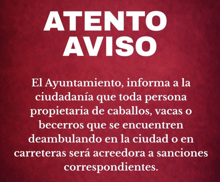Veracruz, Ver.- (AVC/José Juan García) Las autoridades municipales de Tlacotalpan impondrán sanciones a los propietarios de bovinos o caballos que deambulen en las calles de la Ciudad Patrimonio Cultural de la Humanidad o en la carretera. El ayuntamiento de Tlacotalpan publicó el aviso correspondiente en sus redes sociales oficiales. Sin embargo, las autoridades tlacotalpeñas no aclararon a qué tipo de sanciones se harán acreedores los dueños de bovinos o caballos que deambulen en las calles de la ciudad o la carretera. Aquí el texto de la publicación: "ATENTO AVISO. El Ayuntamiento, informa a la ciudadanía que toda persona propietaria de caballos, vacas o becerros que se encuentren deambulando en la ciudad o en carreteras será acreedora a sanciones correspondientes". En el aviso tampoco se precisa la entrada en vigor del acuerdo y si se trata de una medida aprobada por el cabildo de Tlacotalpan o si es una disposición del alcalde Christian Romero Pérez.