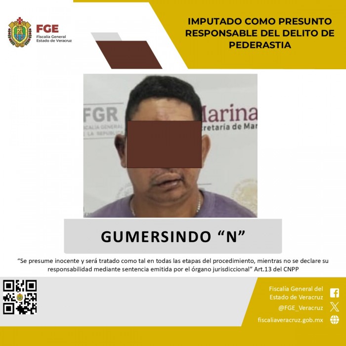 Jamapa, Ver. (AVC) La Fiscalía General del Estado (FGE) imputó a Gumersindo “N” por su presunta responsabilidad en el delito de pederastia, por hechos ocurridos en el municipio de Jamapa, Veracruz.