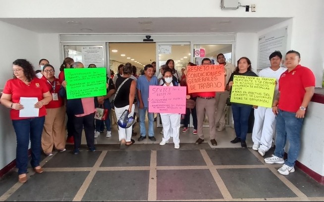 En el Puerto de Veracruz, los trabajadores colocaron lonas en el acceso principal y laterales del HAEV, así como en los pasillos de la Jurisdicción Sanitaria número VIII, donde expusieron sus demandas.