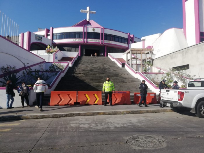 Uno de los filtros de la secretaría de Salud y Protección Civil para aminorar contagios de coornavirus, fue colocado en la calle Unión, por donde habrán de ingresar las personas que desean llegar al recinto religioso, y ahí deberán cumplir con los protocolos de higiene, de lo contrario no podrán pasar.