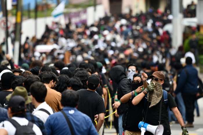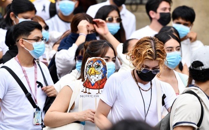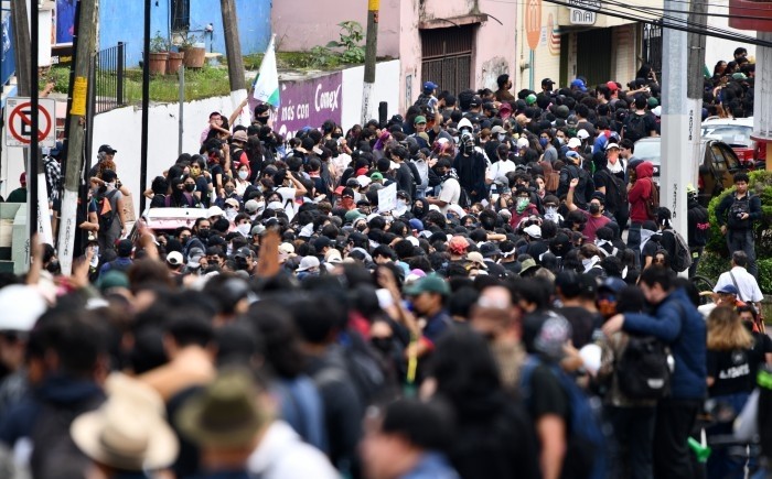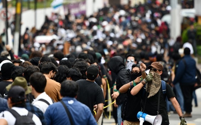 Portando capuchas, gorras y cubrebocas, los jóvenes avanzaron por calles del centro hasta llegar al Circuito Universitario Gonzalo Aguirre Beltrán, frente a la Rectoría.