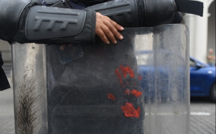 Ante el amedrentamiento de los policías antimotines, los manifestantes tuvieron que desinstalar una carpa que habian puesto en la calle Enríquez.