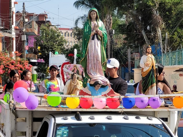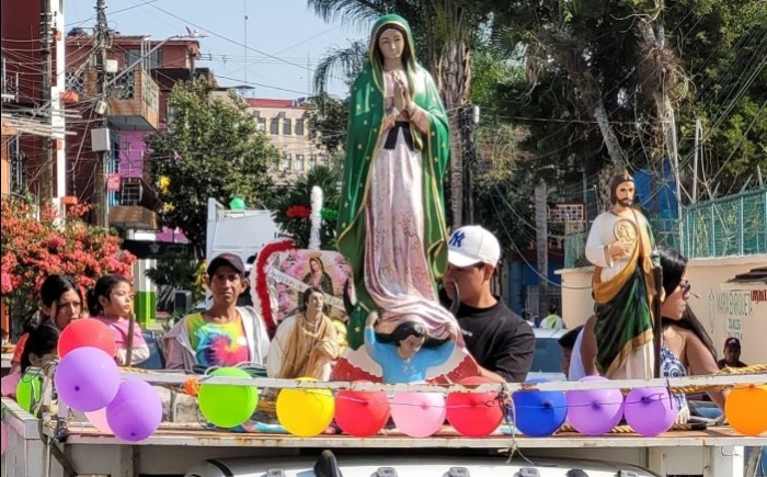 2025-12-07.- Los camiones que a diario ve la población atascados de desechos orgánicos e inorgánicos, este domingo salieron a las calles limpios, adornados con globos, y con la imagen de la Virgen de Guadalupe por delante.