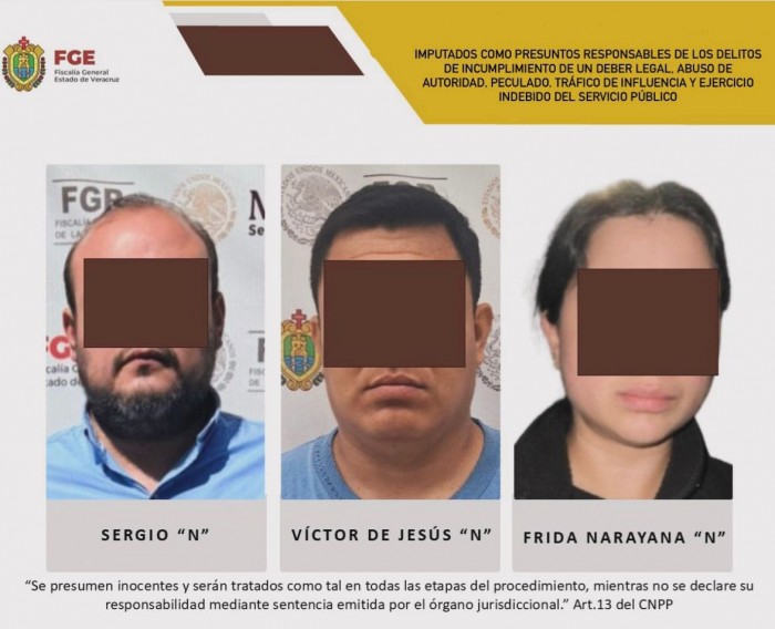 En la audiencia de presentación inicial, un Juez de Control del Poder Judicial del Estado de Veracruz (PJEV) con sede en Pacho Viejo determinó que los ex funcionarios Sergio “N”, Víctor de Jesús “N” y Frida Narayana “N”, son presuntos responsables de los delitos de incumplimiento de un deber legal, abuso de autoridad, peculado, tráfico de influencia y ejercicio indebido del servicio público.