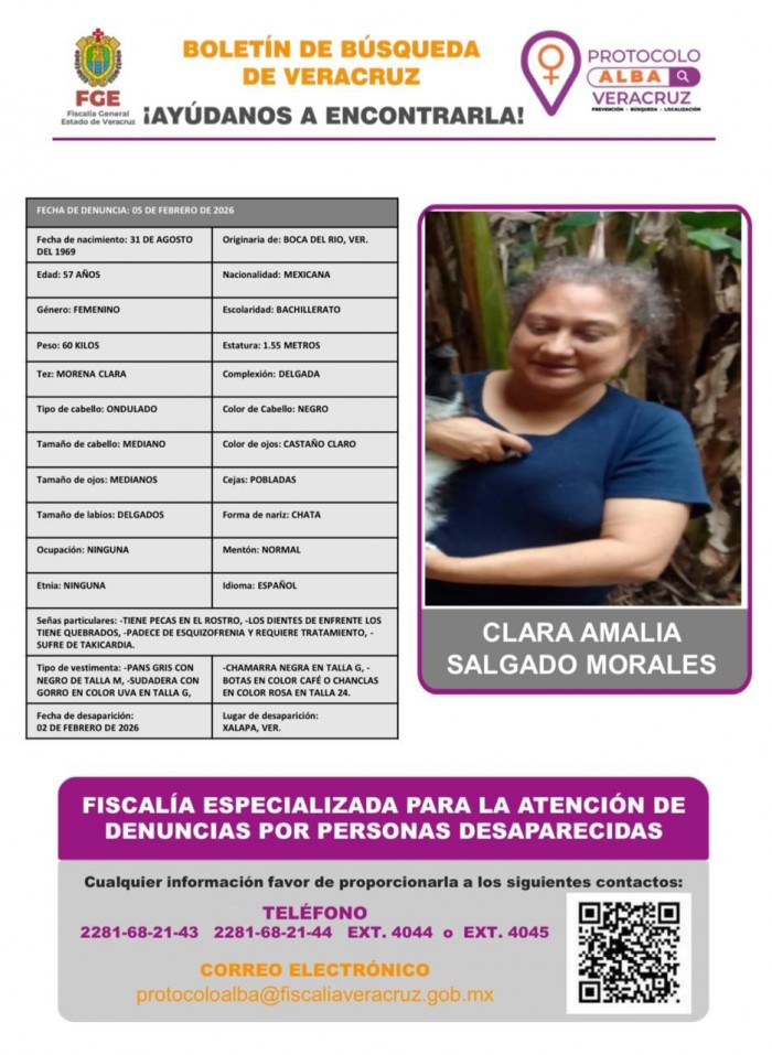 Xalapa, Ver.- (AVC/Verónica Huerta) La empleada Clara Amalia Salgado Morales fue reportada en calidad de desaparecida por su hermana que se manifestó en la mañana del miércoles, en el centro de esta ciudad. La familiar Aurora Salgado Morales pidió el apoyo al gobierno del estado para localizar Clara Amalia que desapareció el 2 febrero 2026 en Xalapa. “Mi hermana salió de la casa y la estamos buscando. Está enferma y requiere medicamento, tenemos por su seguridad” dijo Aurora.