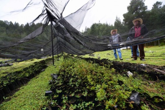 Ejidatarios de Nueva Vaquería muestran su vivero, donde siembran pinos para reforestar el bosque. Foto: Óscar Martínez.