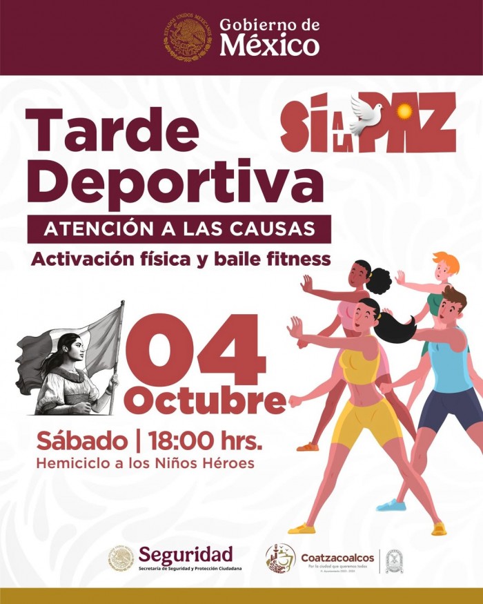 Coatzacoalcos, Ver.- (AVC) El Gobierno de México y el Ayuntamiento de Coatzacoalcos convocaron a la ciudadanía a participar en una tarde deportiva con activación física y baile fitness, el próximo sábado 4 de octubre a las 18:00 horas en el Hemiciclo a los Niños Héroes.