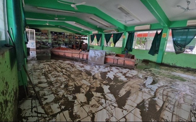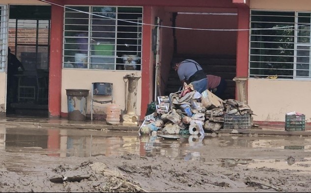 2025-10-13.- El desbordamiento del río Cazones provocó fuertes daños a varios planteles educativos de Poza Rica y en algunos como la Secundaria general Alfonso Arroyo Flores personal y padres de familia comenzaron con trabajos de limpieza.