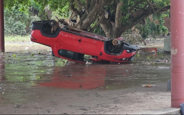 Tan solo en ese plantel más de 12 vehículos arrastrados por la corriente del afluente terminaron en el interior de las instalaciones y entre escombros de la barda perimetral.