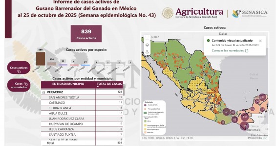 Xalapa, Ver. (AVC) – Veracruz registró 128 casos activos de gusano barrenador del ganado al corte del 25 de octubre de 2025, ubicándose como el quinto estado con más contagios en el país, de acuerdo con el reporte del Servicio Nacional de Sanidad, Inocuidad y Calidad Agroalimentaria (SENASICA). En total, el estado acumula 875 casos confirmados desde el inicio del brote.