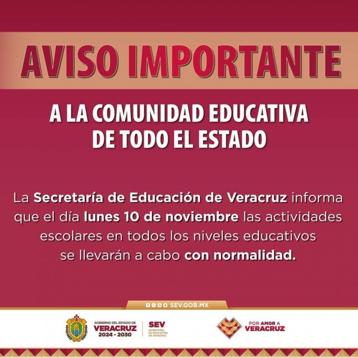 Xalapa, Ver.- (AVC) La Secretaría de Educación de Veracruz (SEV) dio a conocer que este lunes 10 de noviembre de 2025 no se suspenden clases en planteles escolares del estado de Veracruz. El comunicado fue dado a conocer en redes sociales la noche de este domingo pese a que el pronóstico del tiempo señala que este lunes por el paso del frente frío 13 se presentarán vientos de hasta 105 km/hr en la costa central. "La Secretaría de Educación de Veracruz informa que el día lunes 10 de noviembre las actividades escolares en todos los niveles educativos se llevarán a cabo con normalidad". Cabe destacar que la Universidad Veracruzana como medida preventiva suspendió todas las actividades académicas, administrativas y presenciales en los campus Poza Rica-Tuxpan, Veracruz-Boca del Río, Xalapa y Coatzacoalcos-Minatitlán. Mediante un comunicado la casa de estudios informó que la medida tiene como propósito proteger la integridad de la comunidad universitaria y prevenir probables riesgos derivados de las condiciones meteorológicas adversas.