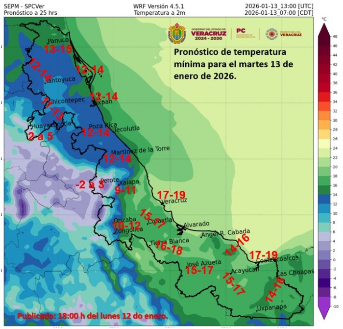 2026-01-12.- Persisten lluvias aisladas, viento del norte y descenso térmico hacia el jueves en Veracruz, con heladas en zonas montañosas.