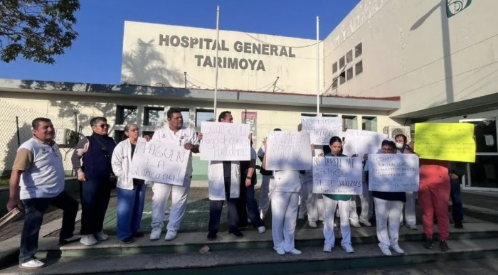 De acuerdo con los manifestantes, alrededor de 80 trabajadores, entre personal administrativo, médicos y enfermeras, no han recibido el depósito de su salario, lo que motivó la protesta frente al hospital.