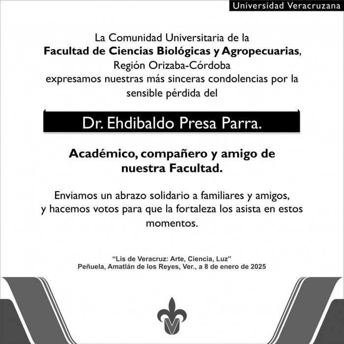 | Xalapa, Ver (AVC) La tarde del martes 7 de enero se registró el hallazgo del cuerpo sin vida de un hombre identificado como Ehdibaldo Presa Parra de 38 años, docente de la Facultad de Ciencias Biológicas de la Universidad Veracruzana (UV) de la región Orizaba-Córdoba. El cuerpo, hallado en el residencial Las Quintas, a un costado de la autopista Orizaba-Córdoba, presentaba huellas de violencia y una herida hecha con arma blanca en el cuello. Aunque inicialmente se informó que la víctima atentó contra su vida, tras las investigaciones realizadas por los Servicios Periciales y la necropsia correspondiente, se determinó que se estaría tratándose de una muerte violenta. Tras el informe del hallazgo, elementos de seguridad municipal y estatal de Veracruz llegaron al lugar para asegurar la zona mientras esperaban a los representantes de la Fiscalía General del Estado (FGE), quienes realizaron las diligencias pertinentes y abrieron una carpeta de investigación. Este miércoles, a través de sus redes sociales, la UV y la facultad de Ciencias Biológicas y Agropecuarias, lamentaron su muerte y por medio de esquelas enviaron sus condolencias a la familia y amigos. "La comunidad Universitaria de la Facultad de Ciencias Biológicas y Agropecuarias, región Orizaba - Córdoba, expresamos nuestras más sinceras condolencias por la sensible pérdida del Dr. Ehdibaldo Presa Parra. Académico, compañero y amigo de nuestra facultad”. Edhibaldo era originario del estado de Puebla, pero vivía en el municipio de Córdoba, Veracruz, desde hacía varios años debido a su trabajo. La víctima era docente y tenía un doctorado en Ciencias por el Instituto de Ecología A. C. (INECOL). Cursó sus estudios en la Benemérita Universidad Autónoma de Puebla (BUAP).
