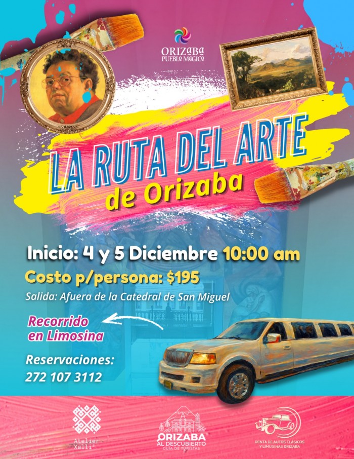 | Orizaba, Ver.- (AVC/Antonio Villagrán) Dos nuevas experiencias se sumarán a la vasta oferta turística del Pueblo Mágico de Orizaba, enfocadas al turismo gastronómico y cultural que visita esta ciudad. Se trata del "Tour Gastronómico" y la "Ruta del Arte" que arrancan en los primeros días del mes de diciembre, para atender la demanda turística que se incrementa en el mes de diciembre. Julio Zacateco, director de Orizaba al descubierto, guía de turistas", informó que todos los jueves y viernes, a partir del 4 de diciembre, se realizarán ambos recorridos a bordo de una limusina. El "Tour Gastronómico" saldrá a las dos de la tarde de la Catedral de San Miguel y se visitarán tres restaurantes y una cafetería de especialidad. "Queremos mostrar la comida tradicional y los platillos más representativos de la ciudad como el tradicional pambazo, el chileatole, las tortas de pierna con papas y el café". La "Ruta del arte" saldrá a las diez de la mañana de la Catedral de San Miguel y consiste en un "Recorrido cultural de alta especialización" para mostrar el patrimonio artístico y muralístico con que cuenta la ciudad. Se visitarán los murales de José Clemente Orozco, plasmado en el Palacio Municipal, así como el de Carlos Castillo Álvarez, en el Poliforum Mier y Pesado, se recorrerá el Museo de Arte del Estado de Veracruz (MAEV) en el antiguo oratorio de San Felipe Neri y se visitará una galería de arte. Además se visitarán varias iglesias en donde se cuenta con murales y esculturas de arte sacro, "este recorrido es para amantes del arte". Explicó que a diferencia de los "city tours", en estos recorridos se profundizará en la historia y el contexto histórico de los lugares a visitar. El cupo máximo es de 14 personas con un mínimo de cuatro para realizar ambos recorridos por el Pueblo Mágico.